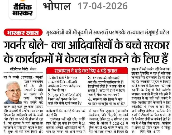 मध्यप्रदेश में जनजातीय समुदाय के विकास कार्यों के प्रभावी क्रियान्वन की रणनीति के लिए आयोजित वर्कशाप में राज्यपाल मंगुभाई पटेल ने सरकार की जमकर क्लास ली.उन्होंने कहा की सरकार और अफसरों में जनजातीय वर्ग के प्रति अपनेपन का अभाव दिखता है.उनके स्वास्थ्य और स्शिक्चा के नाम पर सिर्फ खानापूर्ति की जा रही है.उन्होंने हैरानी जताई की इस समुदाय के लिए केंद्र से मिले २९९ करोड़ रुपये राज्य में लेप्स हो गए.?प्रदेश के मुख्यमंत्री मोहन यादव भी वर्कशाप में मौजूद थे.