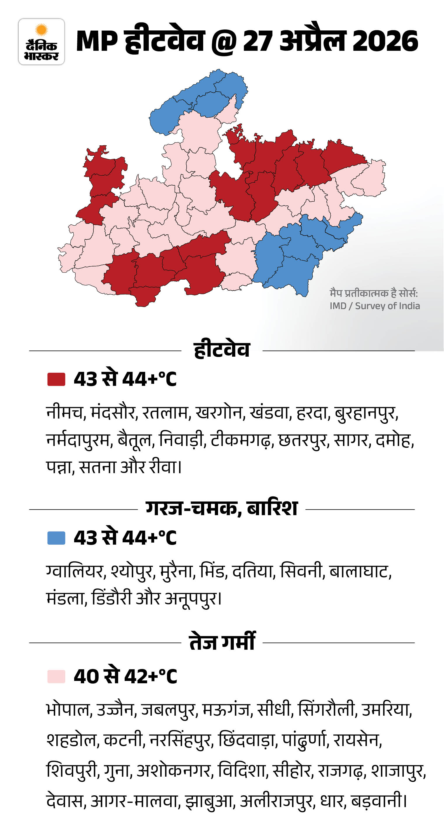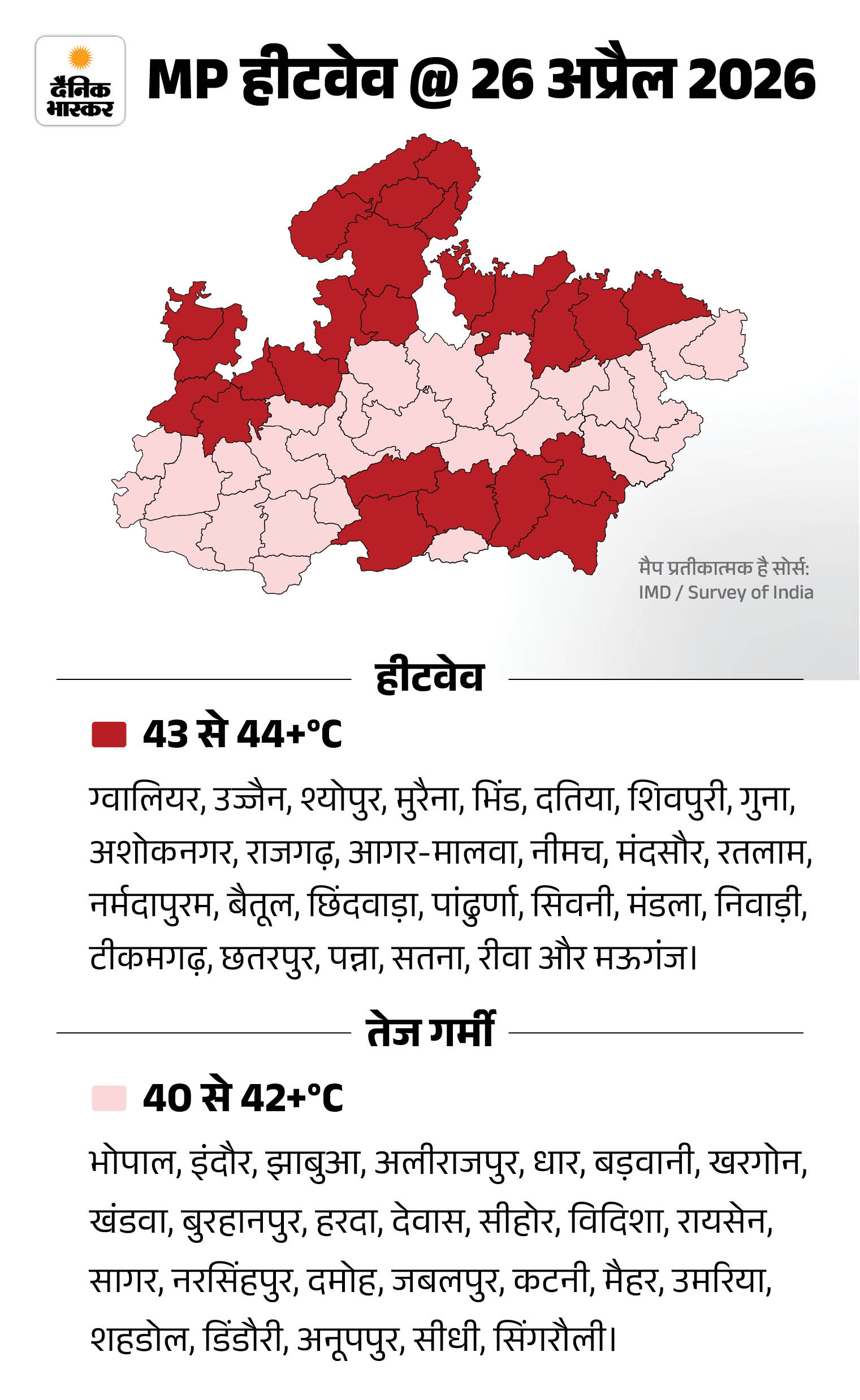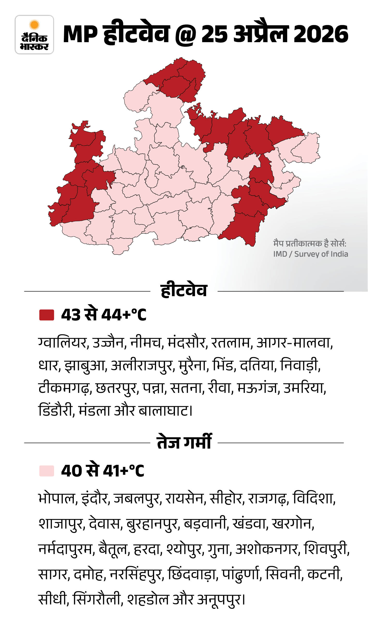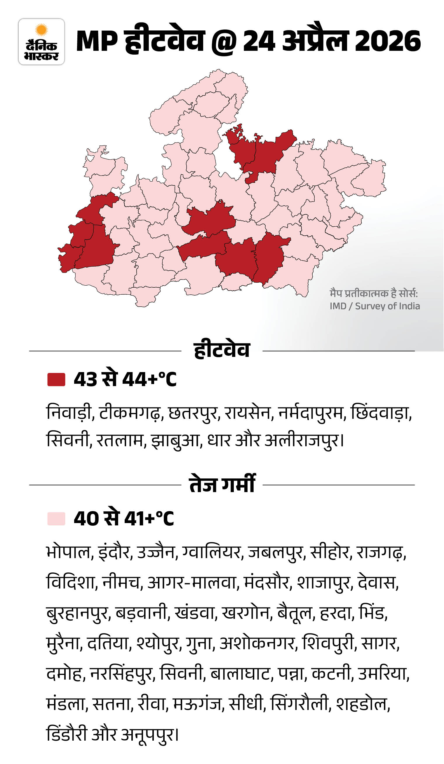मौसम केंद्र भोपाल के अनुसार, शुक्रवार को जिन शहरों में लू चलने का अलर्ट है, उनमें निवाड़ी, टीकमगढ़, छतरपुर, रायसेन, नर्मदापुरम, छिंदवाड़ा, सिवनी, रतलाम, झाबुआ, धार और अलीराजपुर शामिल हैं।