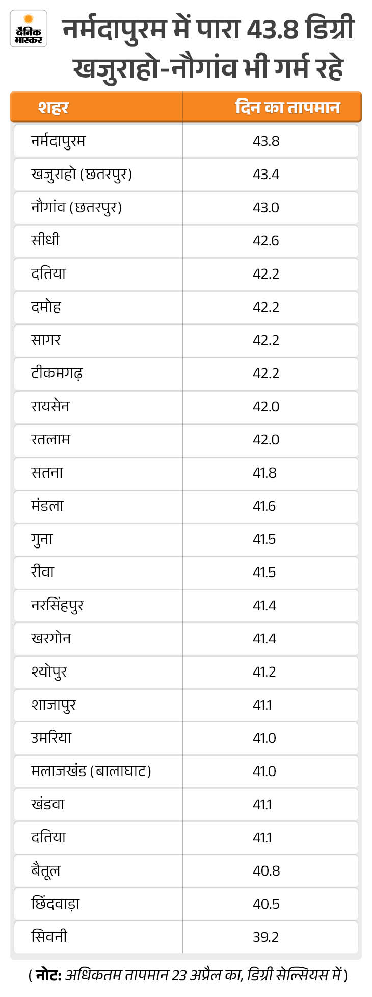 इससे पहले गुरुवार को प्रदेश में पारा सामान्य से 4.2 डिग्री सेल्सियस तक ज्यादा रहा। नर्मदापुरम में तापमान सबसे ज्यादा 43.8 डिग्री सेल्सियस दर्ज किया गया। छतरपुर जिले के खजुराहो में 43.4 डिग्री और नौगांव में 43 डिग्री टेम्परेचर दर्ज किया गया। सीधी में 42.6 डिग्री, दतिया, दमोह, सागर-टीकमगढ़ में 42.2 डिग्री, रायसेन-रतलाम में 42 डिग्री, सतना में 41.8 डिग्री, मंडला में 41.6 डिग्री, गुना-रीवा में 41.5 डिग्री, नरसिंहपुर-खरगोन में 41.4 डिग्री, श्योपुर में 41.2 डिग्री, शाजापुर, खंडवा-दतिया में 41.1 डिग्री, उमरिया में 41 डिग्री तापमान रहा।
