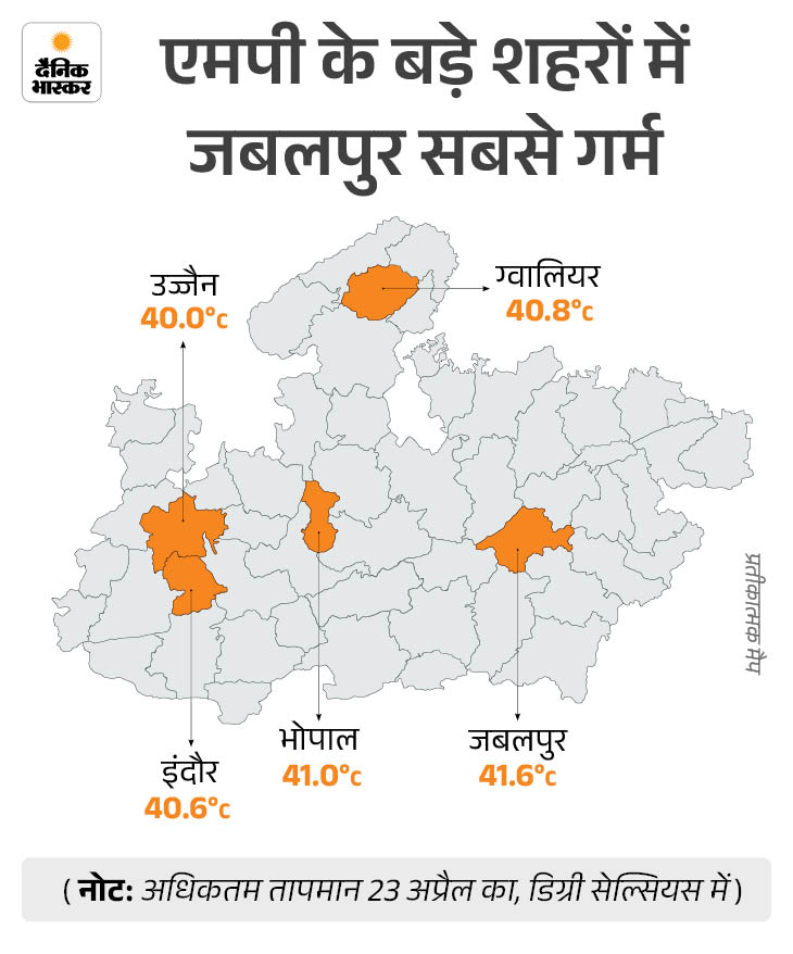 प्रदेश के 5 बड़े शहरों की बात करें तो जबलपुर में 41.6 डिग्री, भोपाल में 41 डिग्री, ग्वालियर में 40.8 डिग्री, इंदौर में 40.6 डिग्री और उज्जैन में 40 डिग्री सेल्सियस पारा पहुंच गया।