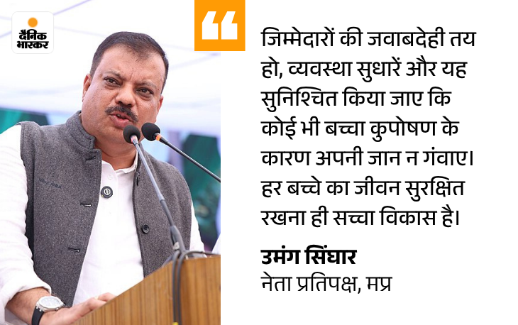 नेता प्रतिपक्ष उमंग सिंगार ने कहा- ऐसे मामले व्यवस्था पर सवाल खड़े करते है प्रदेश विधानसभा की सदन में नेता प्रतिपक्ष उमंग सिंगार ने इस मामले में ट्वीट कर कहा कि सतना से आई यह खबर बेहद पीड़ादायक और झकझोर देने वाली है, कुपोषण के कारण मात्र 4 माह की मासूम बच्ची की मौत हो जाना सिर्फ एक घटना नहीं, बल्कि व्यवस्था की गंभीर विफलता है।