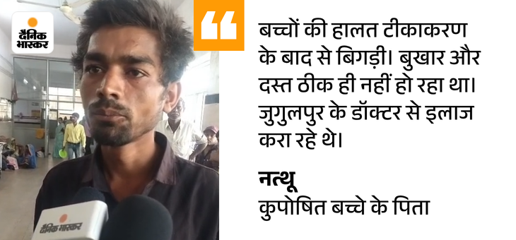 पिता बोले- टीका लगवाने के बाद बिगड़ी हालत रीवा के संजय गांधी अस्पताल के पीडियाट्रिक आईसीयू में जिंदगी और मौत से जूझ रहे नैतिक के पिता नत्थू ने बताया कि जन्म के बाद बच्चों का वजन बढ़कर 4 किलो हो गया था लेकिन बुखार के कारण वजन घट गया।