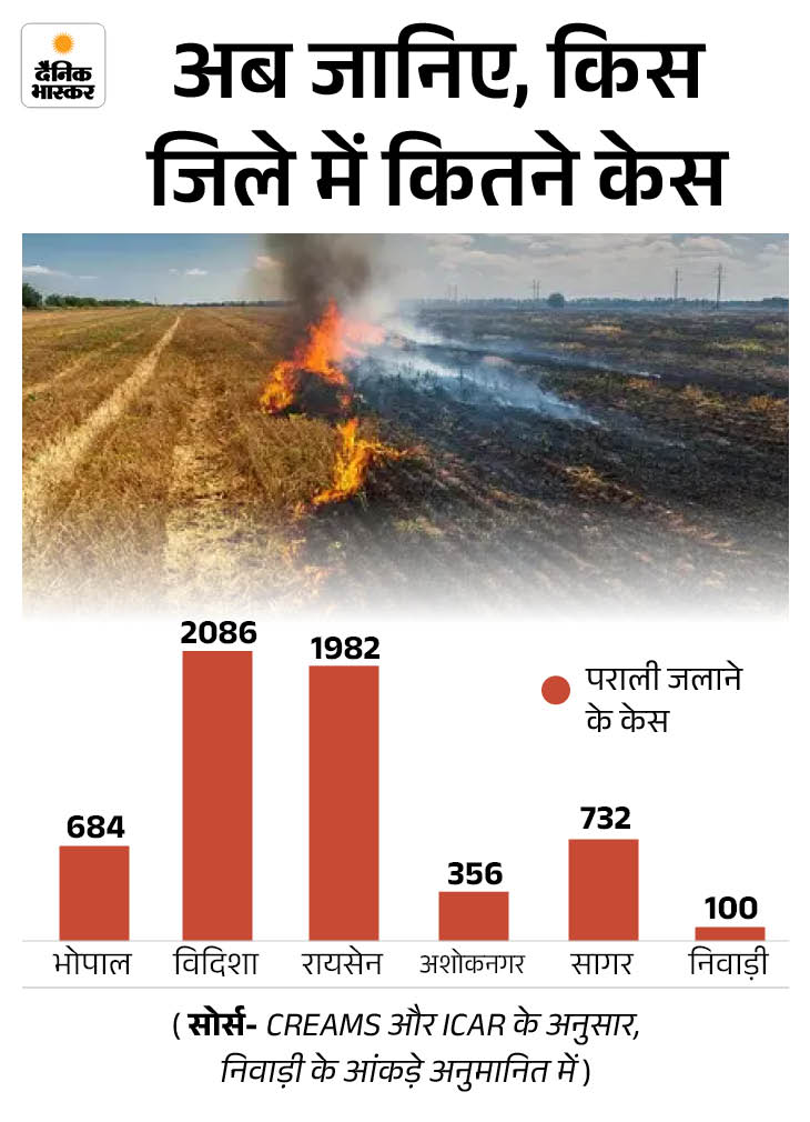 भोपाल, विदिशा, उज्जैन, रायसेन और नर्मदापुरम में नरवाई के मामले हर साल बढ़ रहे हैं। पराली से तापमान बढ़ रहा है और वायु प्रदूषण भी बढ़ रहा है। CREAMS और ICAR के डेटा के मुताबिक, पराली जलाने के मामलों में मध्य प्रदेश देश में पहले स्थान पर है। यह उत्तरप्रदेश और हरियाणा से भी आगे है।