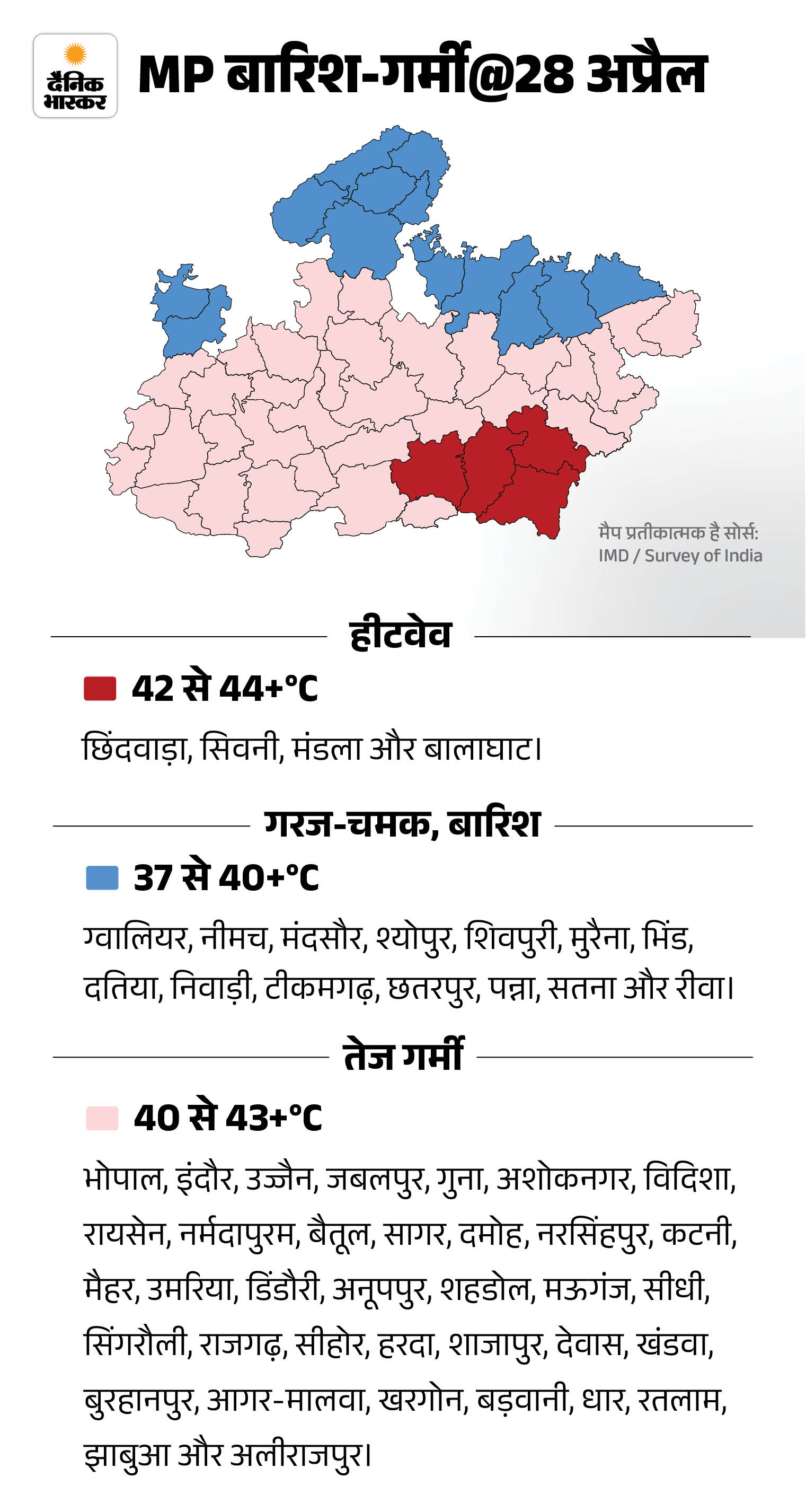 रविवार को आंधी-बारिश के बीच भीषण गर्मी पड़ी। खजुराहो के बाद नौगांव में 44.6 डिग्री, सागर-नर्मदापुरम में 44.4 डिग्री, दमोह में 44.2 डिग्री और श्योपुर, मंडला, दतिया, टीकमगढ़ में 44 डिग्री तापमान दर्ज किया गया।