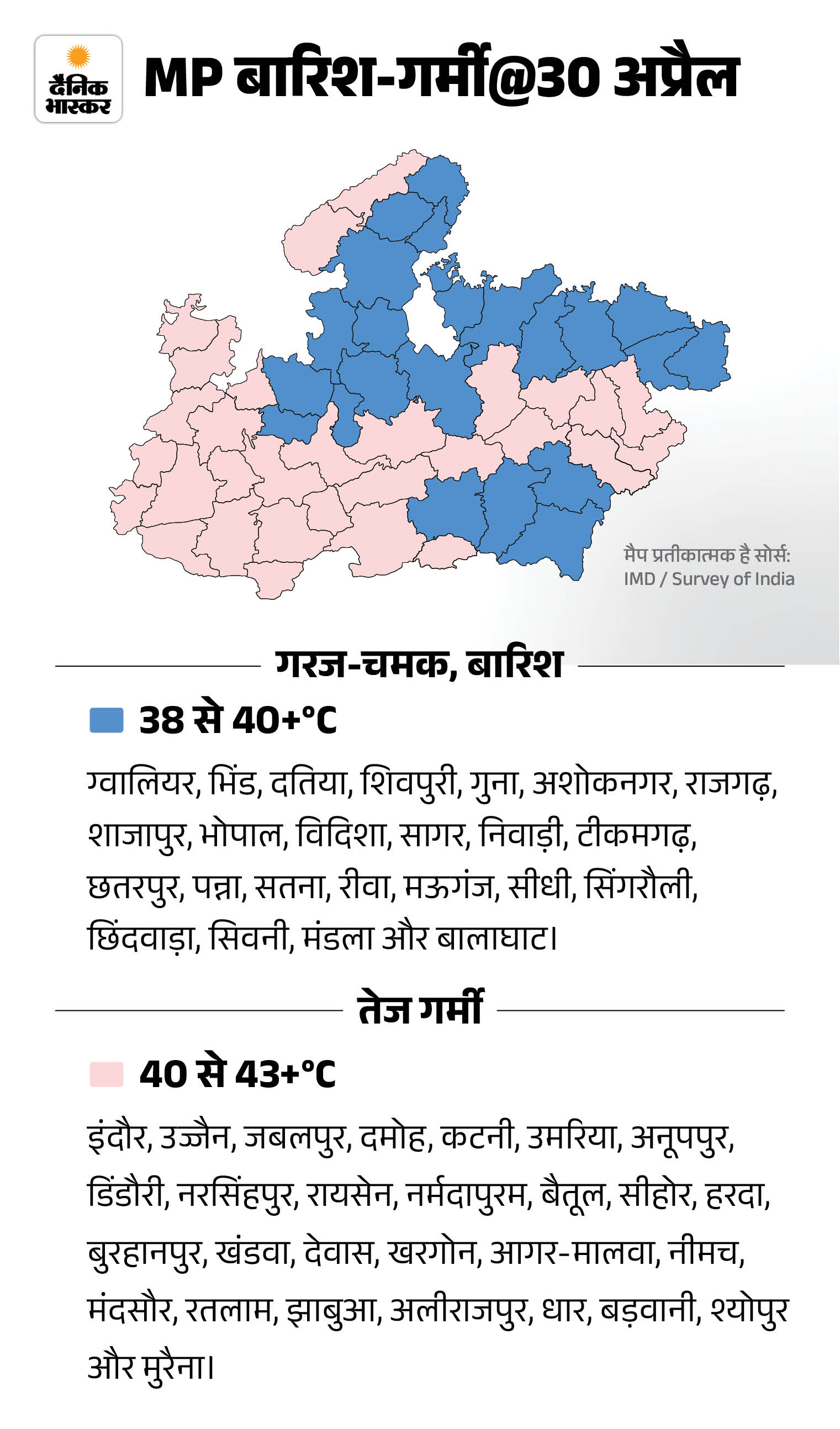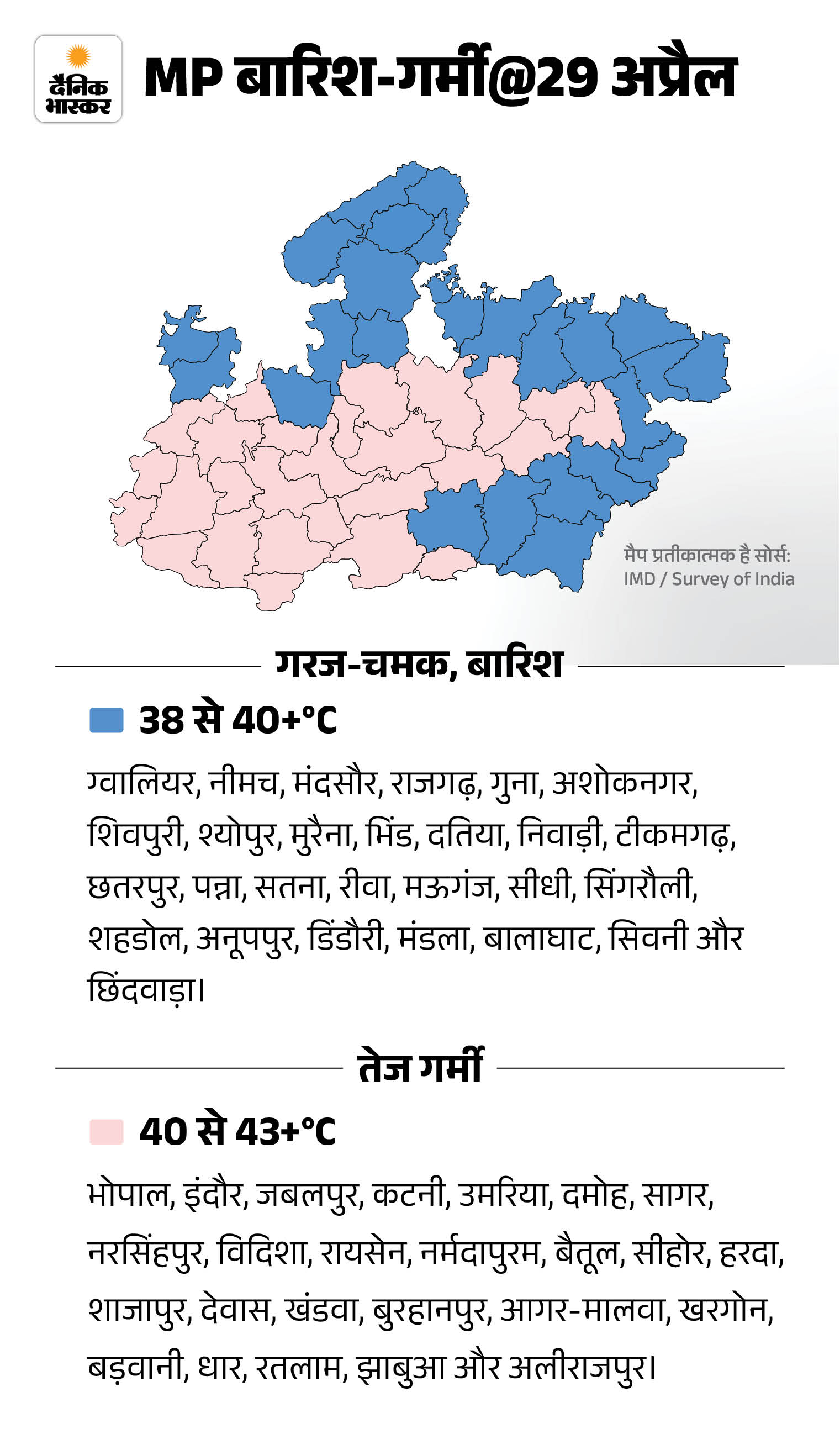 इसके चलते इंदौर-उज्जैन में दिन-रात दोनों गर्म रहेंगे। श्योपुर, मुरैना, रीवा, मऊगंज, सीधी और सिंगरौली में गरज-चमक और बारिश का अलर्ट है। भोपाल, जबलपुर समेत अन्य जिलों में तेज गर्मी पड़ेगी।