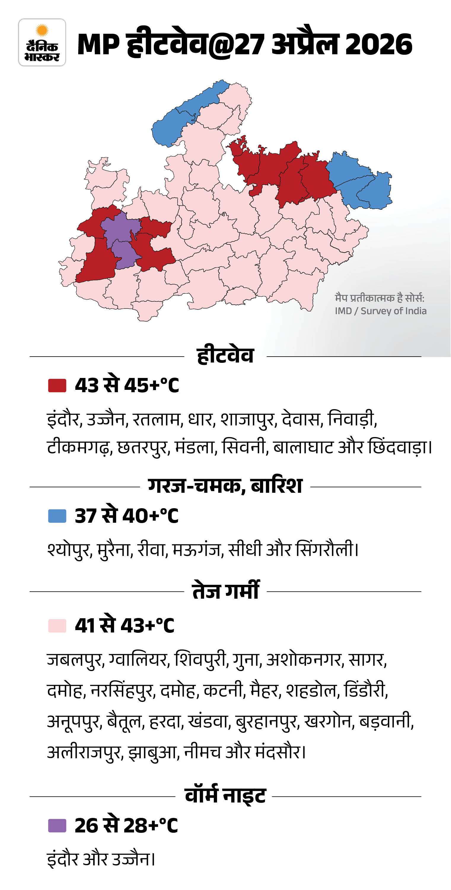 • जबलपुर में 26 अप्रैल को तापमान सबसे ज्यादा 43.5 डिग्री रहा। इससे पहले साल 2022 को अधिकतम तापमान 43.9 डिग्री दर्ज किया गया था।