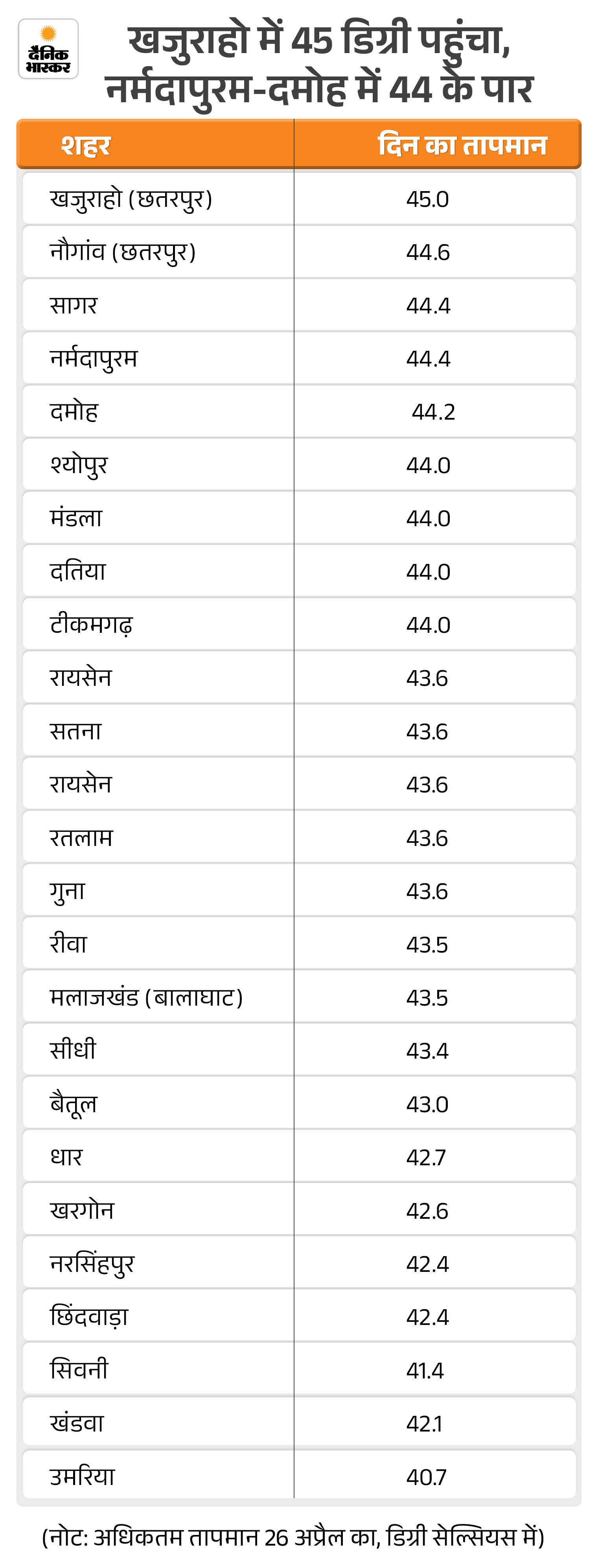 शाजापुर में 43.7 डिग्री, रायसेन, सतना, रतलाम-गुना में 43.6 डिग्री, रीवा-मलाजखंड में 43.5 डिग्री, सीधी में 43.4 डिग्री और बैतूल में 43 डिग्री रहा। प्रदेश के 5 बड़े शहरों में भोपाल-इंदौर में तापमान 43 डिग्री पहुंचा। जबलपुर में 43.5 डिग्री, ग्वालियर में 42.9 डिग्री और उज्जैन में 42.5 डिग्री रहा।
