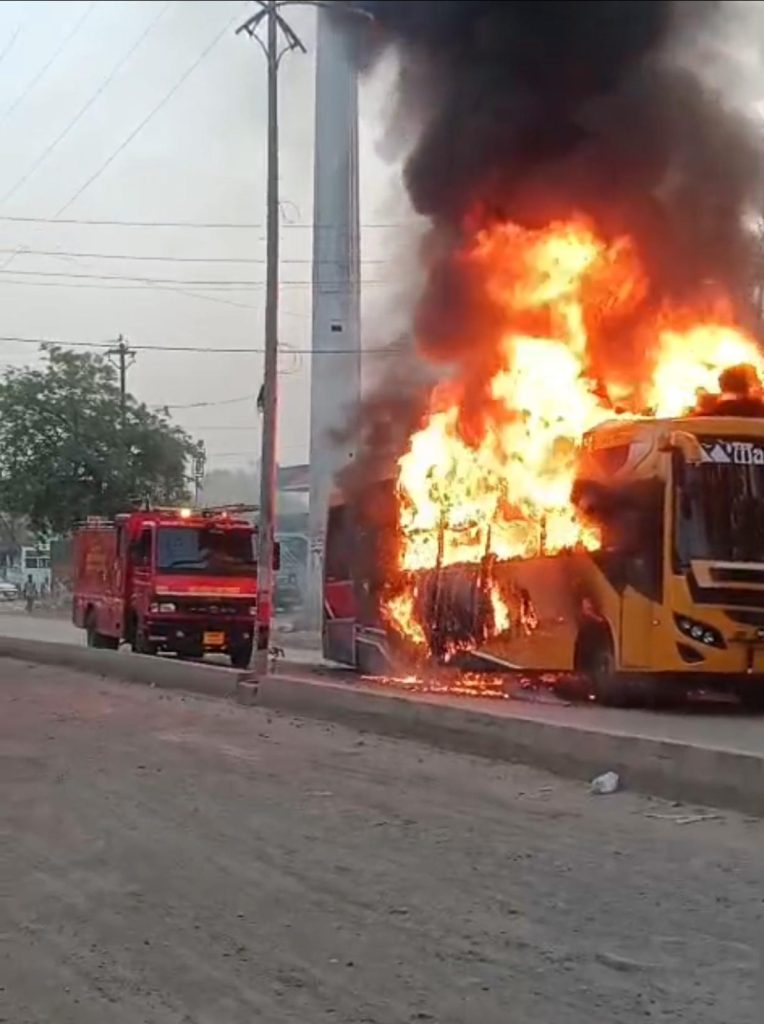 बस जैसे ही झांसी रोड थाना परिसर के सामने पहुंची, अचानक तेज धमाके के साथ बस का पिछला टायर फट गया। टायर फटने से उत्पन्न चिंगारी बस के पिछले हिस्से तक पहुंची, जिससे वहां आग लग गई। कुछ ही क्षणों में बस से धुआं उठने लगा और आग फैलने लगी।