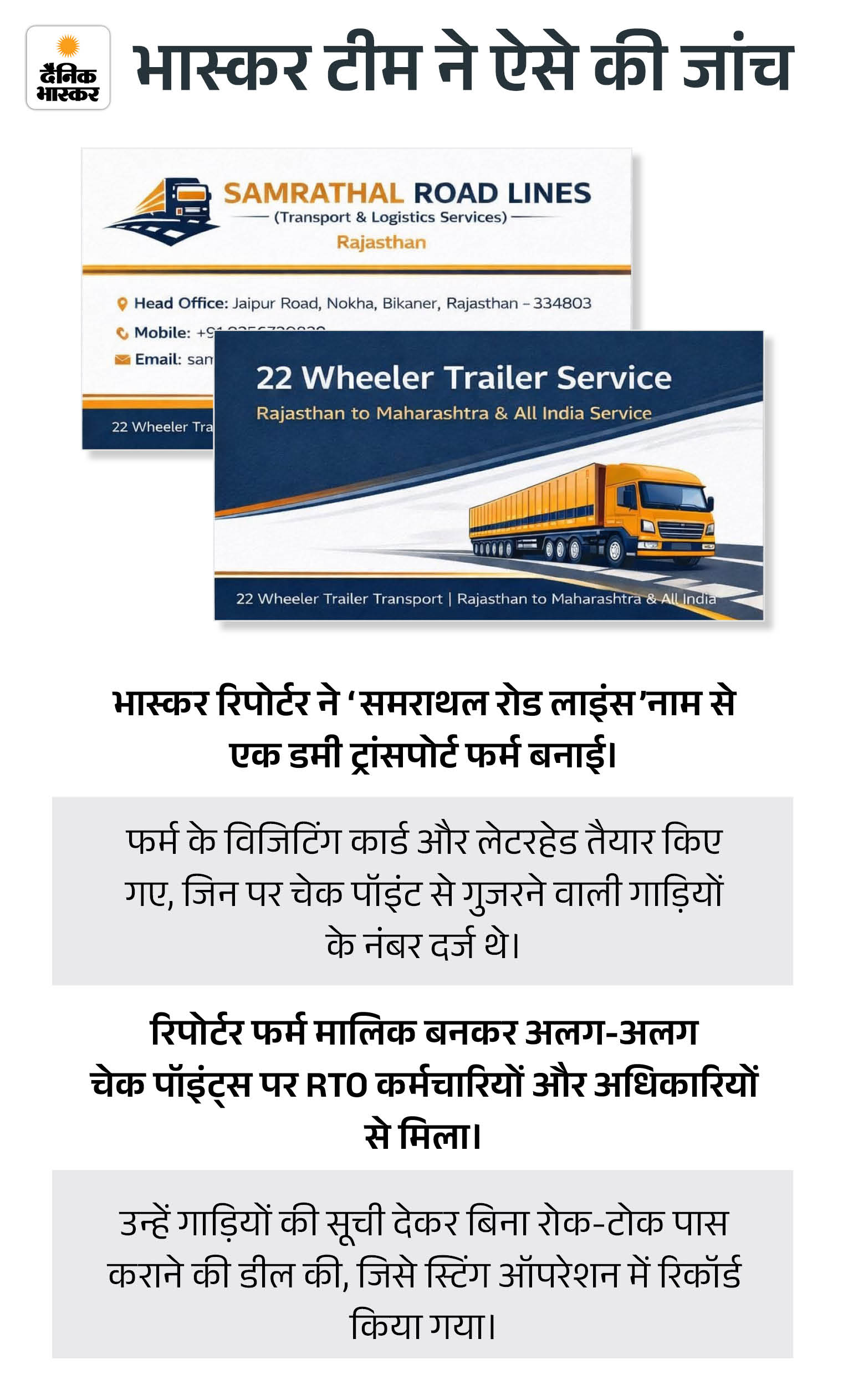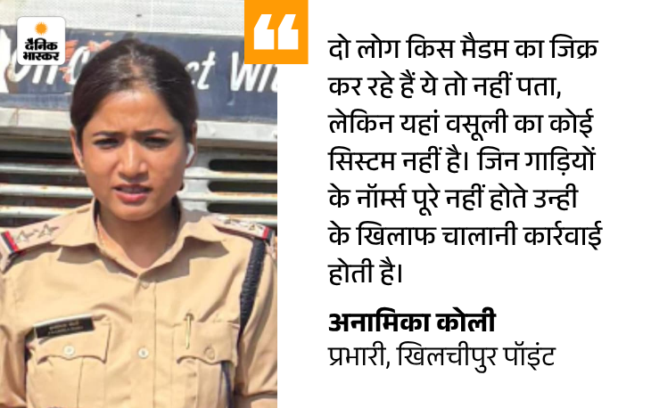 सामने आया कि इस चेक पॉइंट पर प्रभारी अनामिका कोली समेत 5 महिलाएं तैनात हैं, जिनमें से किसी एक पर नेटवर्क चलाने की आशंका है। 15 दिन पहले भास्कर ने दलाली नेटवर्क का खुलासा किया था, जिसके बाद कॉन्स्टेबल आरपी सिंह हनोतिया और अमित झरबड़े का ट्रांसफर हुआ। इसके बावजूद अब खुलेआम के बजाय छिपकर वसूली जारी है।
