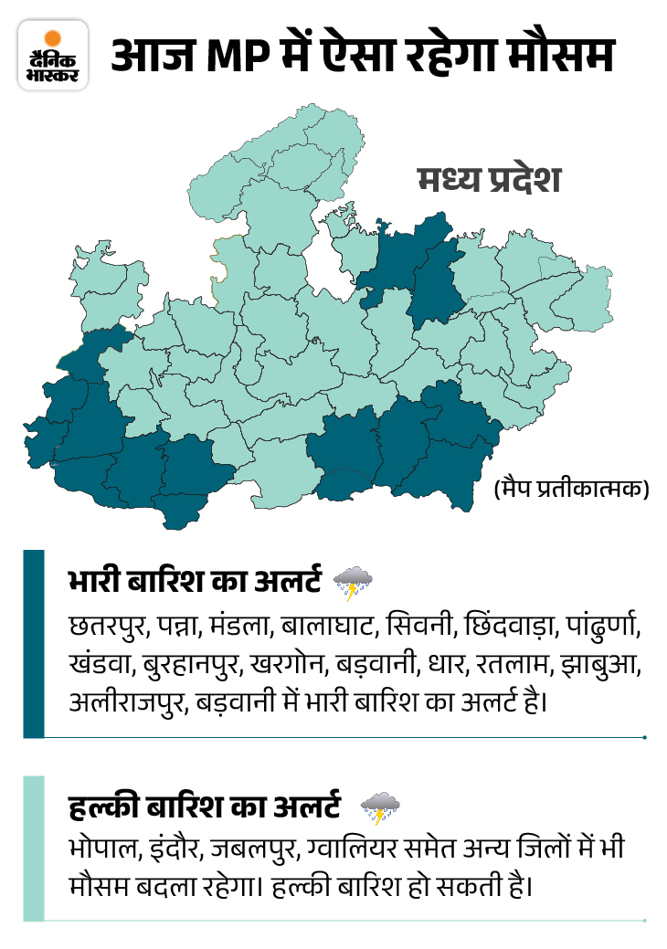 मौसम विभाग ने अगले 24 घंटे में छतरपुर, पन्ना, मंडला, बालाघाट, सिवनी, छिंदवाड़ा, पांढुर्णा, खंडवा, बुरहानपुर, खरगोन, बड़वानी, धार, रतलाम, झाबुआ, अलीराजपुर, बड़वानी में भारी बारिश का अलर्ट जारी किया है। सीनियर मौसम वैज्ञानिक डॉ. दिव्या ई. सुरेंद्रन ने बताया कि एमपी के उत्तरी हिस्से में ट्रफ लाइन गुजर रही है। वहीं, साइक्लोनिक सर्कुलेशन भी एक्टिव है। इस वजह से बारिश हो रही है, जो आगे भी जारी रहेगी।