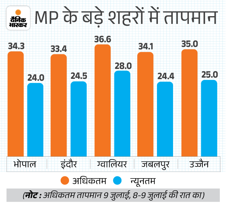 बड़े शहरों की बात करें तो भोपाल में 34.3 डिग्री सेल्सियस, इंदौर में 33.4 डिग्री, ग्वालियर में 36.6 डिग्री, जबलपुर में 34.1 डिग्री और उज्जैन में 35 डिग्री तापमान दर्ज किया गया। बैतूल में तापमान सबसे कम 28.5 डिग्री रहा। खरगोन-पचमढ़ी में 29.2 डिग्री और सिवनी में यह 29.8 डिग्री सेल्सियस दर्ज किया गया।