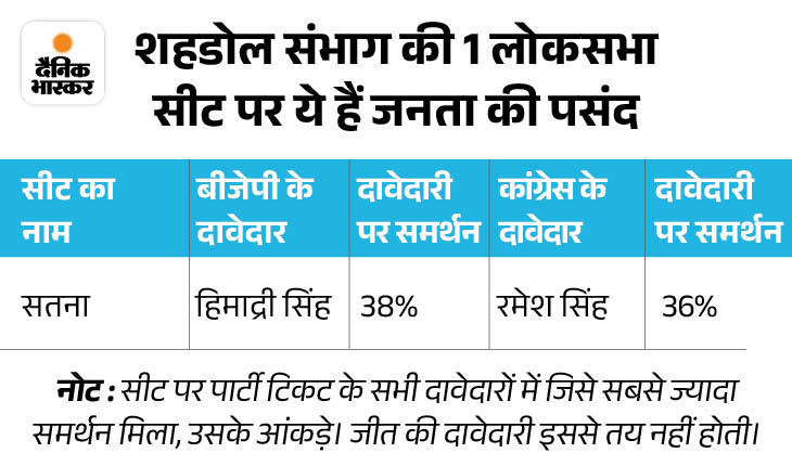 इन तीनों में से सिर्फ सतना सीट ऐसी है जहां लोगों ने मौजूदा भाजपा सांसद गणेश सिंह को दोबारा प्रत्याशी के तौर पर सबसे ज्यादा समर्थन दिया है।