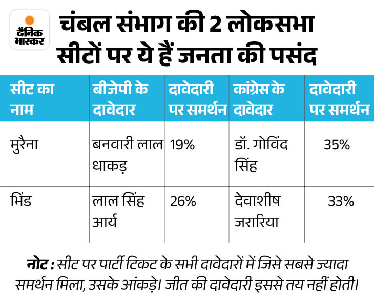 जनता ने सर्वे में इन दोनों की जगह मौजूदा सांसद के बजाय किसी और को समर्थन दिया है। मुरैना से बनवारी लाल धाकड़ और भिंड से लाल सिंह आर्य की टिकट के लिए दावेदारी को ज्यादा समर्थन मिला है।