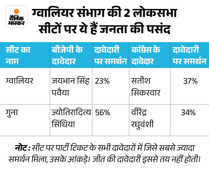 ग्वालियर से भाजपा के विवेक शेजवलकर सांसद हैं। हालांकि सर्वे में टिकट की दावेदारी पर उनसे ज्यादा जयभान सिंह पवैया को समर्थन मिला है। इस सीट पर जनता ने पिछली बार कांग्रेस से उतरे चेहरे के बजाय भी किसी और को पसंद किया है।