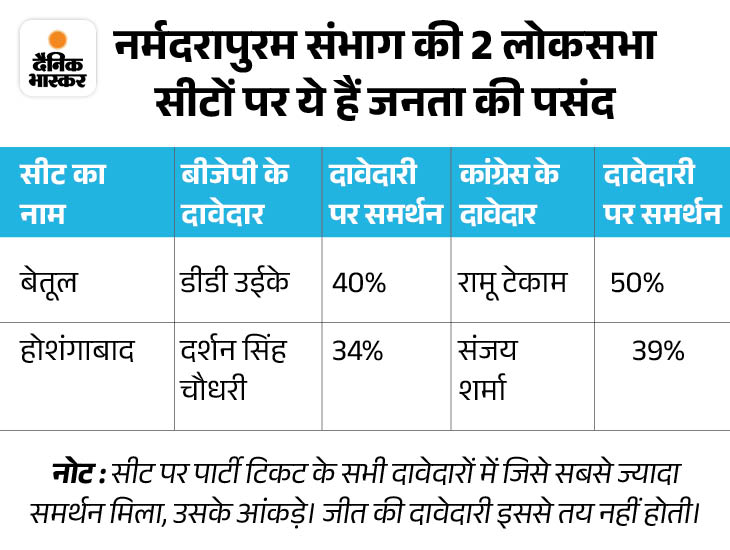 बैतूल सीट से मौजूदा भाजपा सांसद डीडी उईके और 2019 में कांग्रेस के टिकट पर दूसरे स्थान पर रहे रामू टेकाम दोनों को ही लोगों ने दोबारा प्रत्याशी के तौर पर समर्थन दिया है। होशंगाबाद सीट से कांग्रेस प्रत्याशी के तौर पर जनता ने नए चेहरे को पसंद किया है।