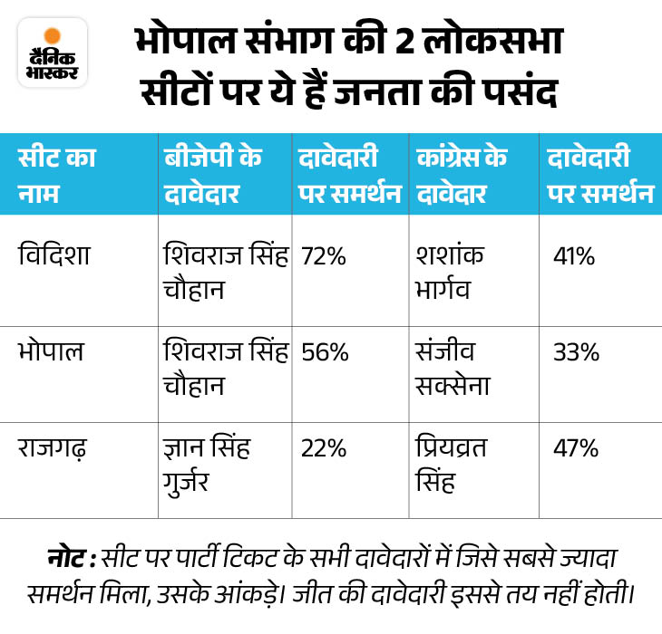 भोपाल और विदिशा दो सीटों पर मौजूदा भाजपा सांसद के बजाय लोगों ने राज्य के पूर्व मुख्यमंत्री शिवराज सिंह चौहान को बतौर प्रत्याशी सबसे ज्यादा पसंद किया है।