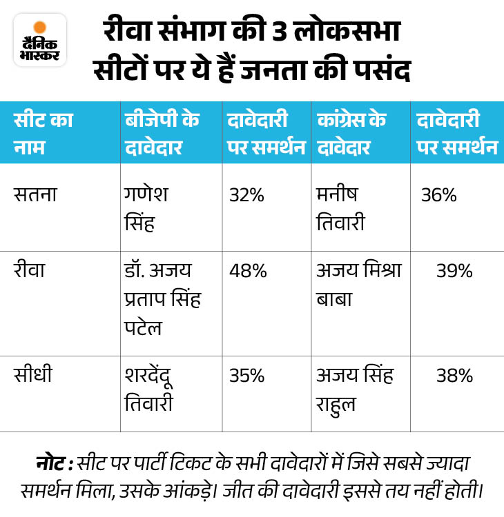 कांग्रेस के दावेदारों की बात करें तो सिर्फ सीधी सीट से 2019 में दूसरे स्थान पर रहे अजय अर्जुन सिंह को ही दोबारा प्रत्याशी बनाने पर जनता ने समर्थन दिया है। रीवा और सतना दोनों सीटों पर लोग कांग्रेस के प्रत्याशी के तौर पर नया चेहरा पसंद कर रहे हैं।