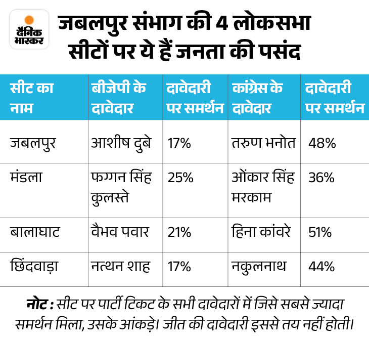 बालाघाट में भी मौजूदा भाजपा सांसद डॉ. ढाल सिंह बिसेन के बजाय लोगों ने वैभव पवार को बतौर भाजपा प्रत्याशी ज्यादा समर्थन दिया है। मंडला सीट पर लोगों ने मौजूदा भाजपा सांसद फग्गन सिंह कुलस्ते को ही बतौर प्रत्याशी समर्थन दिया है।