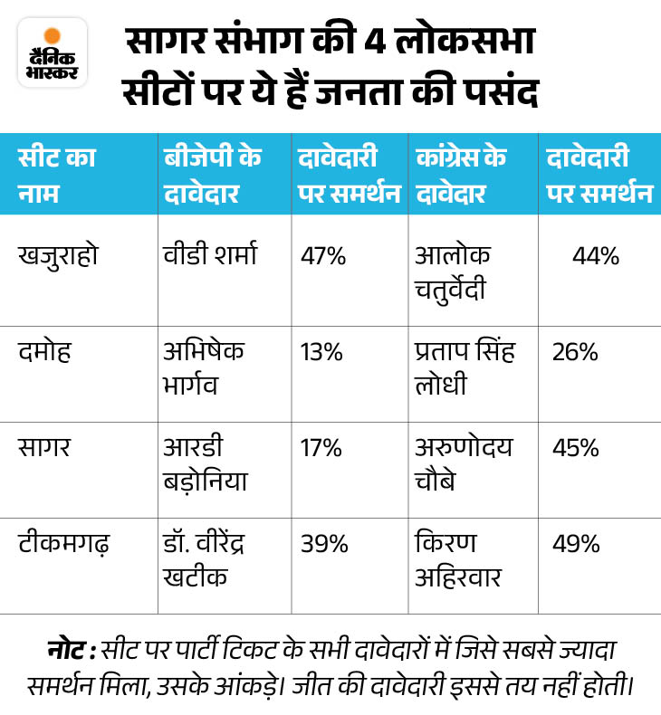 सागर सीट से भाजपा के मौजूद सांसद राजबहादुर सिंह के बजाय इस बार लोगों ने आरडी बड़ोनिया को बतौर प्रत्याशी ज्यादा समर्थन दिया है। वहीं खजुराहो और टीकमगढ़ से मौजूदा भाजपा सांसद वीडी शर्मा और डॉ. वीरेंद्र खटीक को जनता ने दोबारा प्रत्याशी के तौर पर समर्थन दिया है।