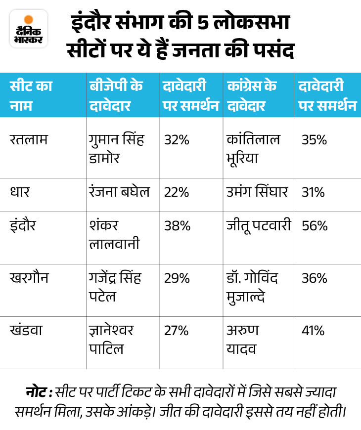 रतलाम, इंदौर, खरगौन और खंडवा से मौजूदा भाजपा सांसदों को जनता ने दोबारा प्रत्याशी के तौर पर समर्थन दिया है। हालांकि धार से मौजूदा भाजपा सांसद छतर सिंह दरबार के बजाय लोगों ने इस सीट पर भाजपा प्रत्याशी के तौर पर रंजना बघेल को ज्यादा समर्थन दिया है।