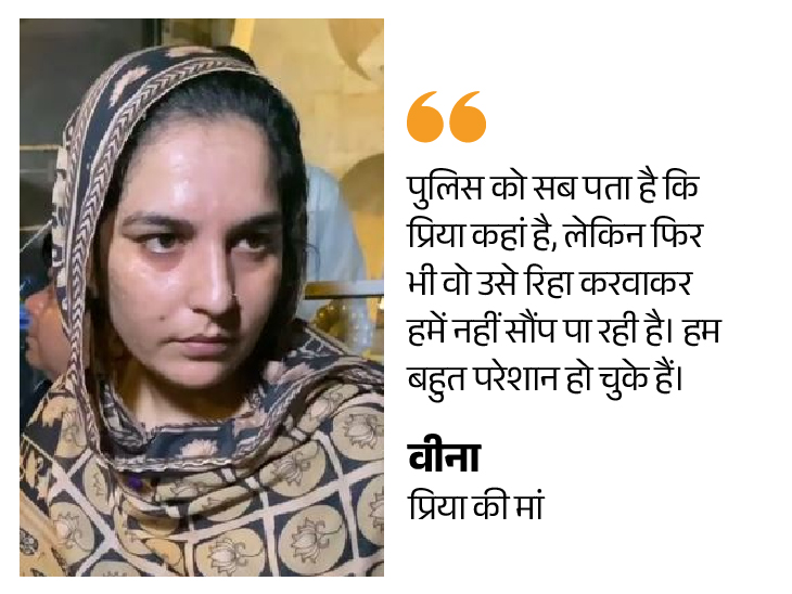 वे कहती हैं, ‘दुआ के वक्त ही प्रिया बाहर गई और फिर कहां चली गई, पता ही नहीं चला। पुलिस को सब पता है कि प्रिया कहां है, लेकिन फिर भी नहीं दे रही है।’