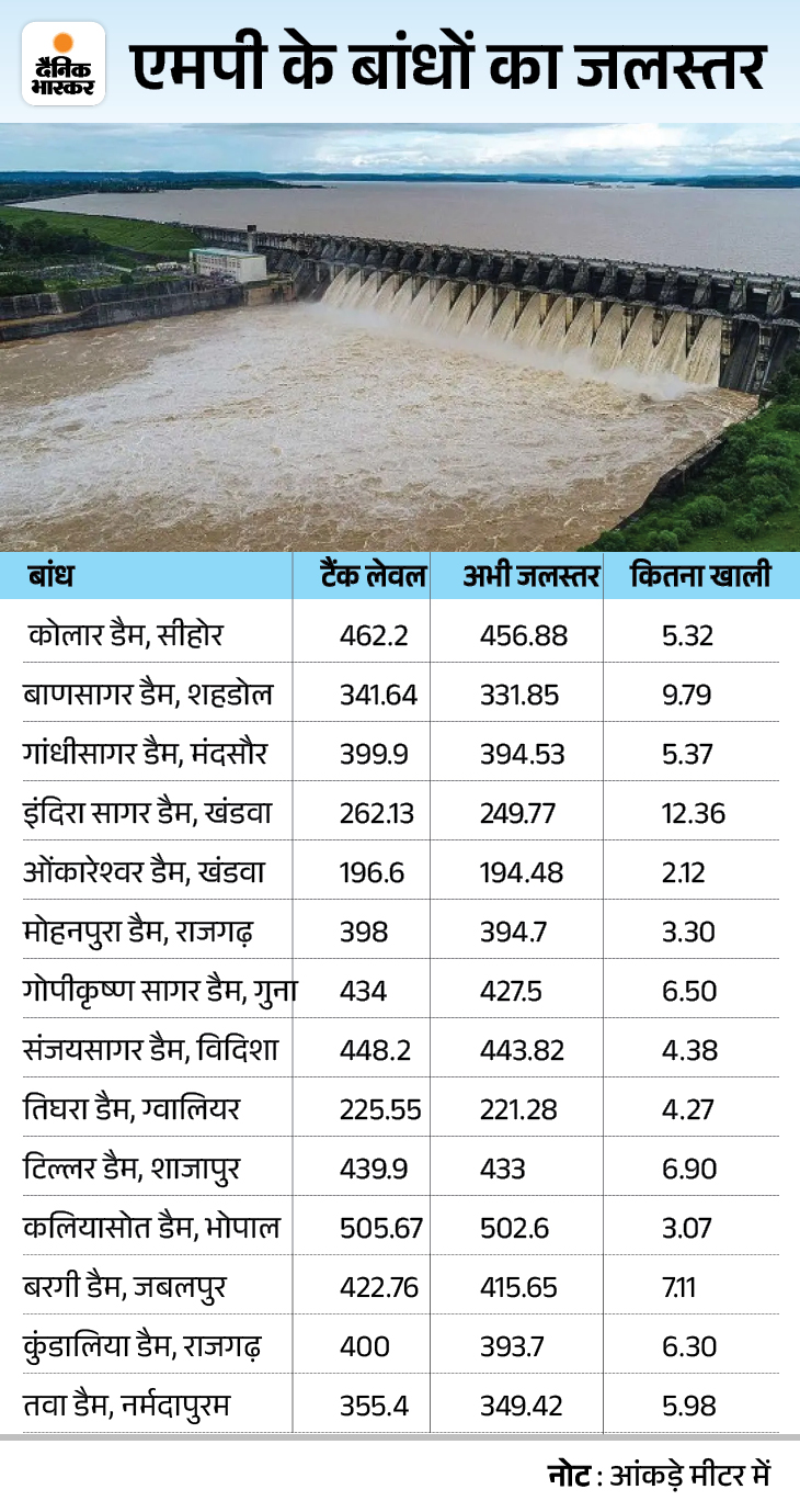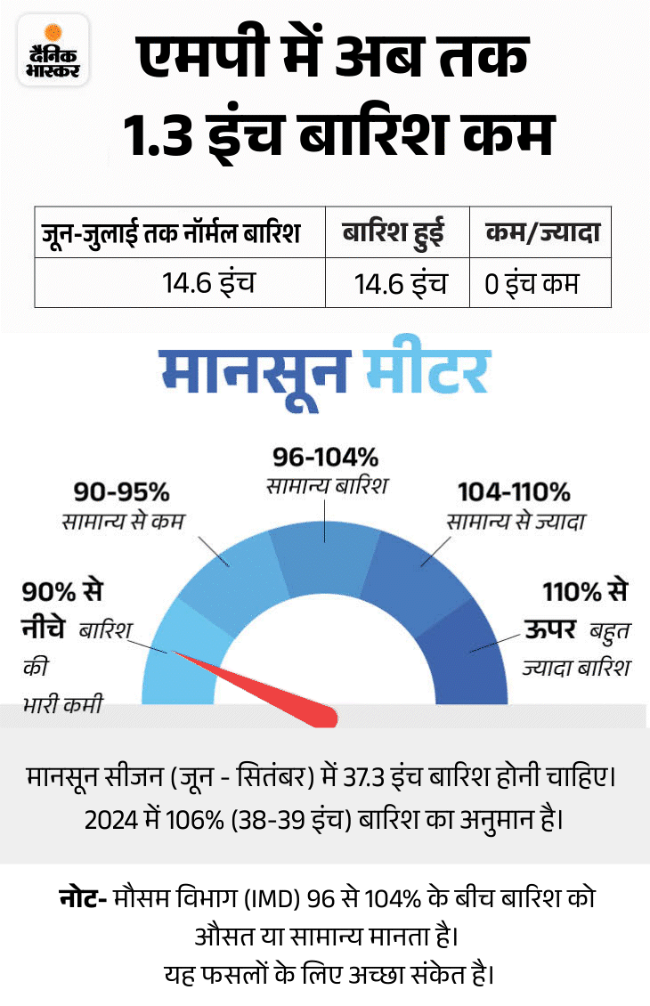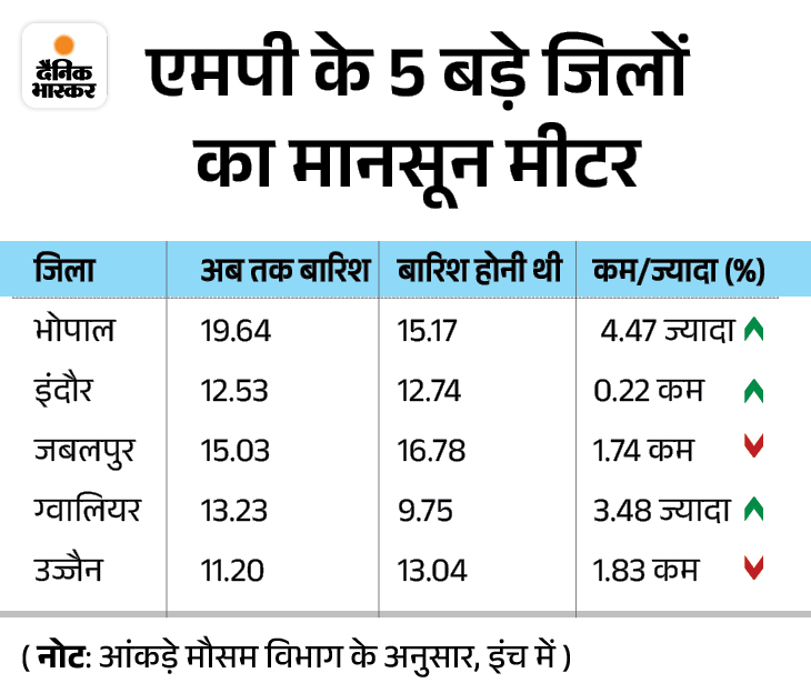 सीजन में पहली बार प्रदेश में बारिश का आंकड़ा औसत बारिश के बराबर आया है। प्रदेश में 14.6 इंच बारिश हो चुकी है। अब तक इतनी ही बारिश होनी चाहिए थी। प्रदेश के पश्चिमी हिस्से- भोपाल, इंदौर, उज्जैन, नर्मदापुरम, ग्वालियर-चंबल संभाग में एवरेज से 4% ज्यादा पानी गिर चुका है जबकि पूर्वी हिस्से- रीवा, सागर, जबलपुर और शहडोल संभाग में 5% कम बारिश हुई है।