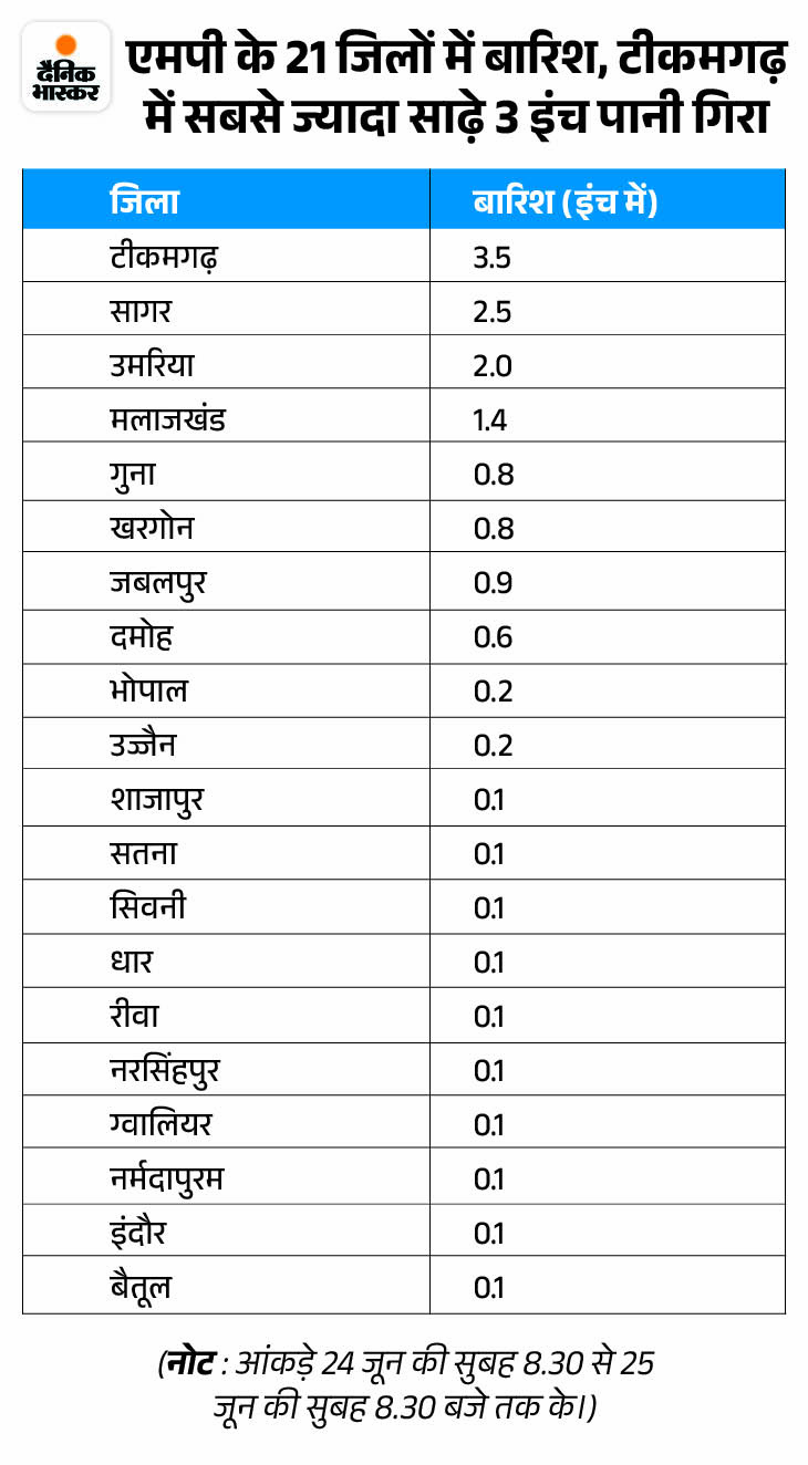 बुधवार को प्रदेश के 24 जिलों में बारिश हुई। टीकमगढ़ में सबसे ज्यादा 3.5 इंच पानी गिरा। रीवा में 2.4 इंच और उमरिया में डेढ़ इंच बारिश हुई। वहीं, गुना, दमोह, जबलपुर, खजुराहो, मलाजखंड में आधा इंच पानी गिरा। भोपाल, बैतूल, धार, ग्वालियर, नर्मदापुरम, सतना, सिवनी, इंदौर, खंडवा, खरगोन, पचमढ़ी, रतलाम, उज्जैन, मंडला, नरसिंहपुर, रीवा में भी बारिश हुई।