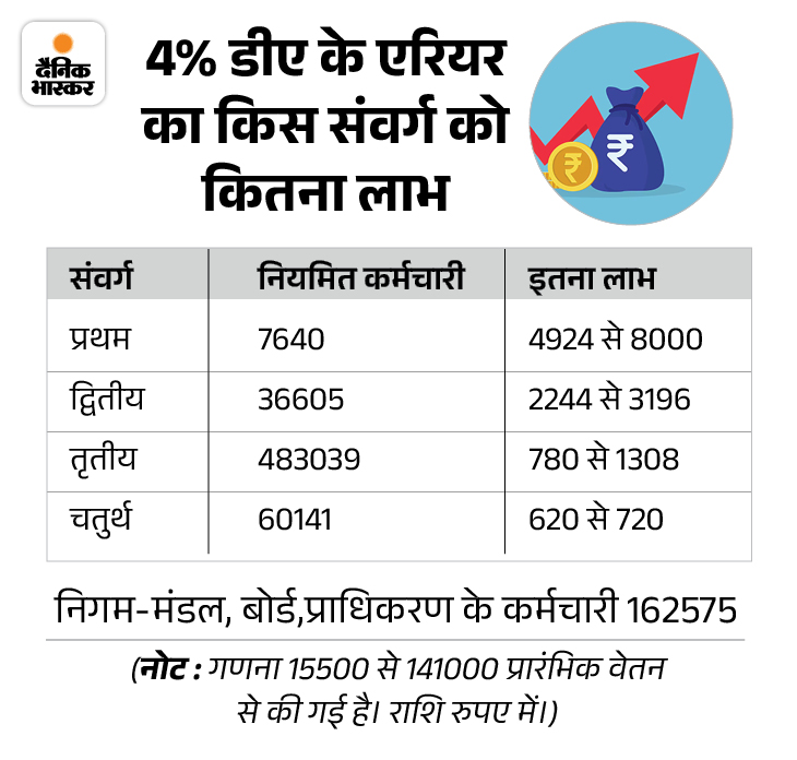जनवरी 2024 में 4 प्रतिशत डीए बढ़ने से सरकारी कर्मचारियों की सैलरी में संवर्ग के मुताबिक 620 रुपए से 8000 रुपए तक की बढ़ोतरी हुई है। इस हिसाब से देखें तो जुलाई में दो महीने का एरियर दिए जाने पर कर्मचारियों के बैंक खातों में 1240 से 16 हजार रुपए तक आएंगे। तीन महीने का एरियर मिलने पर 1860 से 24 हजार रुपए अकाउंट में आएंगे।