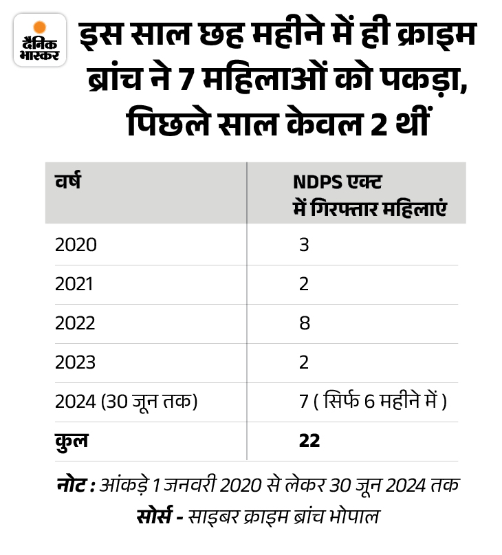 दरअसल, एमपी में ड्रग्स की तस्करी के कारोबार में महिलाओं का दखल बढ़ रहा है। क्राइम ब्रांच और सेंट्रल नारकोटिक्स ब्यूरो के आंकड़ों की पड़ताल की। इसमें पता चला कि क्राइम ब्रांच ने इस साल ड्रग्स की तस्करी में पिछले साल के मुकाबले 3 गुना ज्यादा महिलाओं को पकड़ा है।