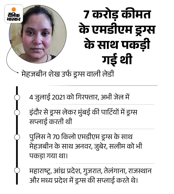 इंदौर पुलिस ने 4 जुलाई 2021 को देश के सबसे बड़े ड्रग्स रैकेट का खुलासा किया था। इसके तार महाराष्ट्र, आंध्र प्रदेश, गुजरात, तेलंगाना, राजस्थान और मध्यप्रदेश से जुड़े थे। 70 करोड़ के इस एमडीएम ड्रग्स रैकेट में पुलिस ने मुंबई की महजबीन शेख नाम की महिला को गिरफ्तार किया था।