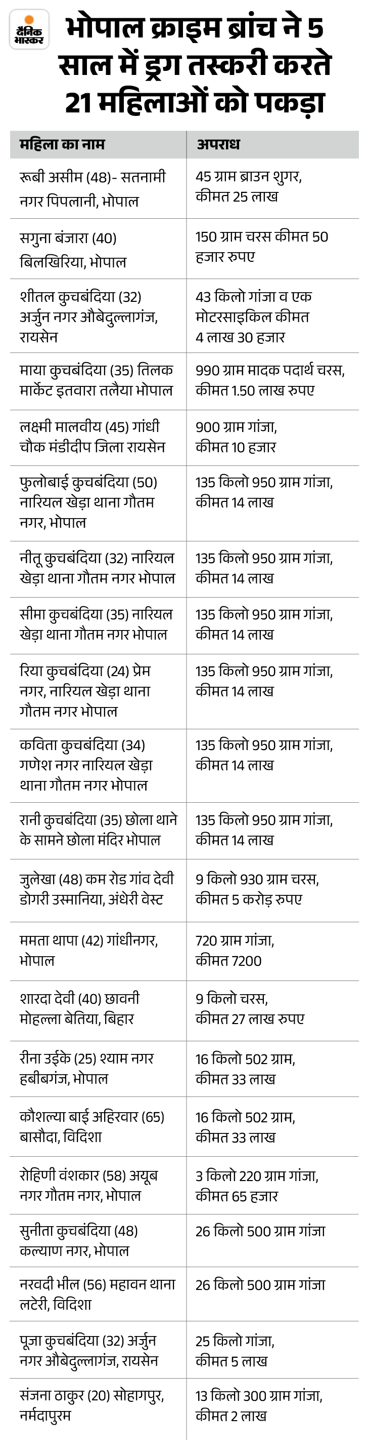 तीन महीने पहले 8 अप्रैल को भोपाल क्राइम ब्रांच ने मंगलवारा इलाके से 2 महिलाओं को गिरफ्तार किया। इनके पास से 16 किलो गांजा मिला, जिसकी बाजार में कीमत 3 लाख रुपए थी। पुलिस पूछताछ में दोनों महिलाओं ने बताया कि वे गांजे की ये खेप विशाखापट्टनम से ट्रेन में लाई थीं। इनमें से एक महिला रीना उईके पहले भी गांजे की तस्करी में पकड़ी जा चुकी है।