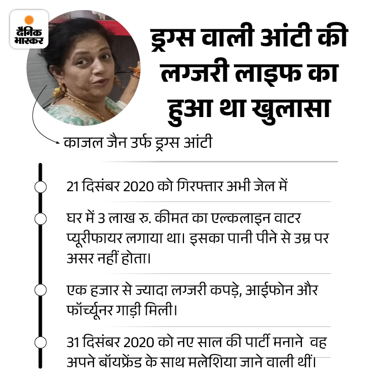 21 दिसंबर 2020 को विजयनगर पुलिस ने काजल जैन को गिरफ्तार किया था। काजल, ड्रग्स के आदी युवाओं के बीच ड्रग्स आंटी के रूप मशहूर थीं। जब वह पकड़ी गई तो उसके नेटवर्क का खुलासा हुआ। काजल ने इंदौर में बैठकर ड्रग्स का कारोबार पूरे देश में फैला रखा था।