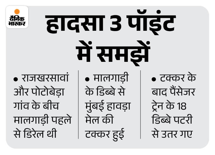 पैसेंजर ट्रेन का इंजन डिरेल हुई मालगाड़ी की बोगी से टकराया। इसके बाद ट्रेन के 18 डिब्बे पटरी से उतर गए। हादसा राजखरसवां और बड़ाबाम्बो के बीच हुआ।